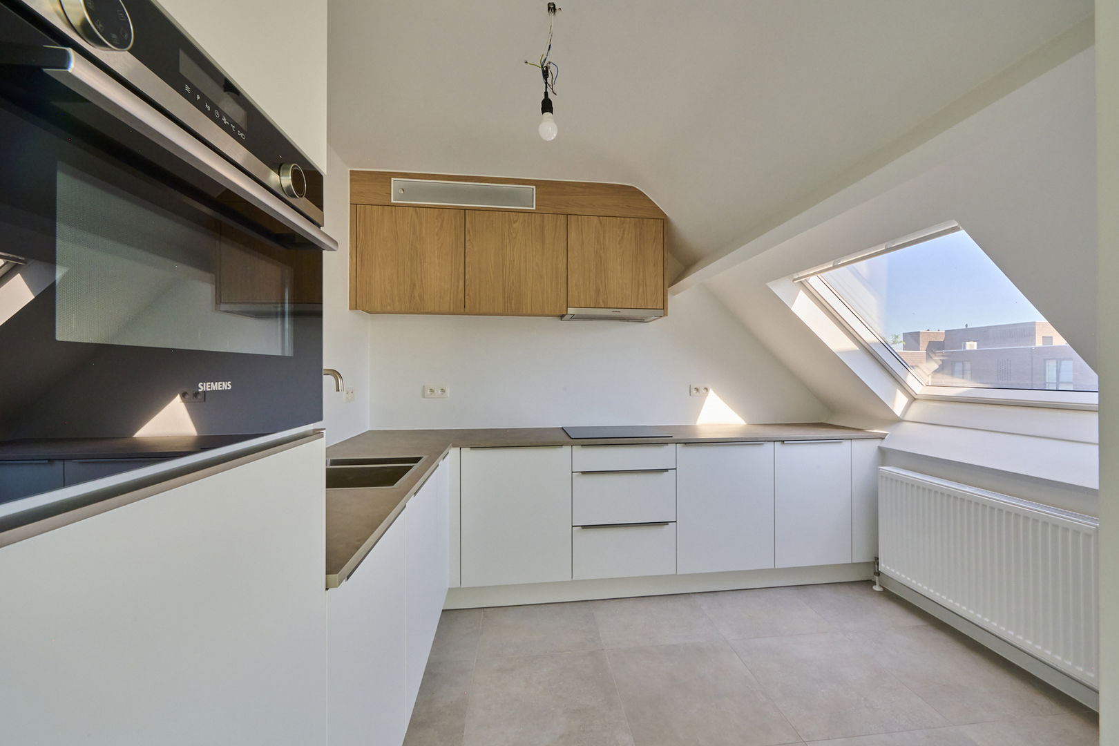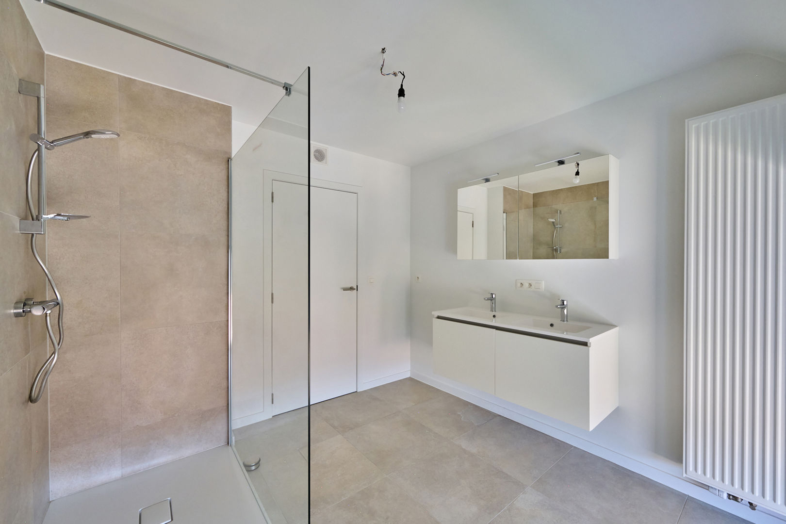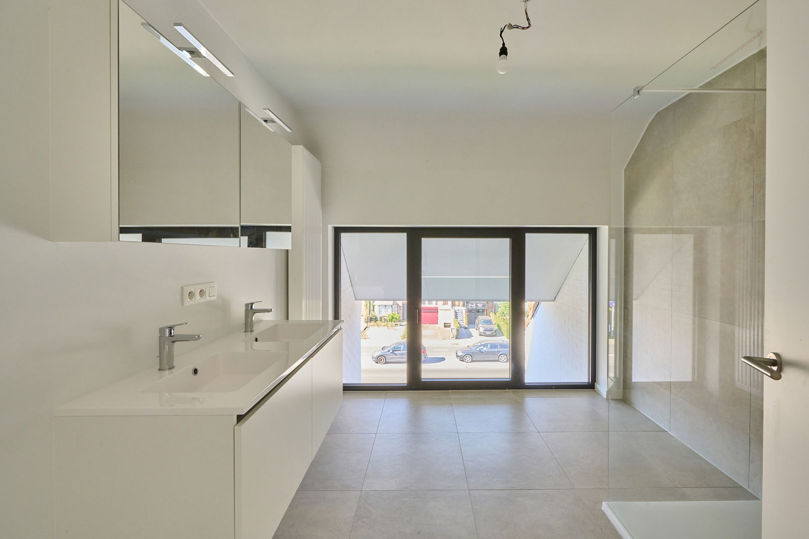 Inkomhal met toegang tot de open leefruimte van om en bij de 40m². Moderne keuken voorzien van de nodige inbouwtoestellen (kookplaat met dampkap, vaatwasser, oven, koelkast, spoelbak). De plafondhoge ramen zorgen voor massa's lichtinval en toegang tot het terras. Nachtgedeelte met apart toilet, toegang tot de ruime badkamer met dubbele lavabo en inloopdouche. Bergplaats met CV-ketel. Er zijn 2 ruime slaapkamers voorzien. Extra troef: voor dit appartement is er een privé-berging (nr. 4) voorzien op de begane grond waar je je spullen veilig kan stockeren.
