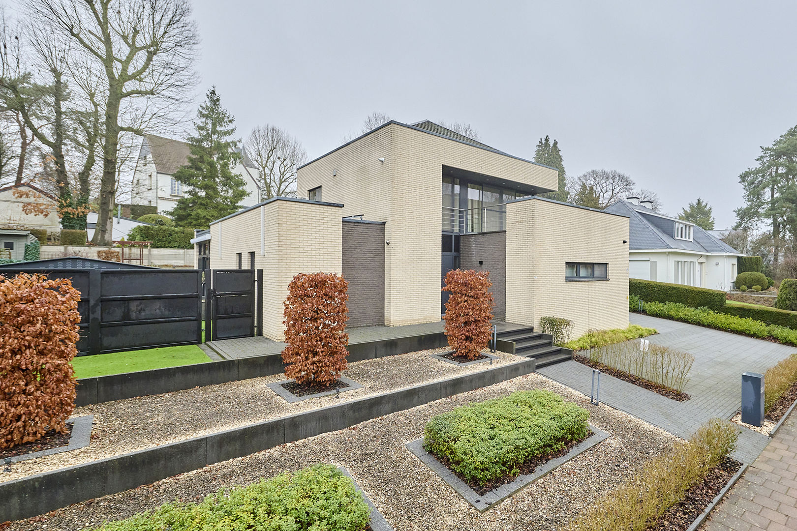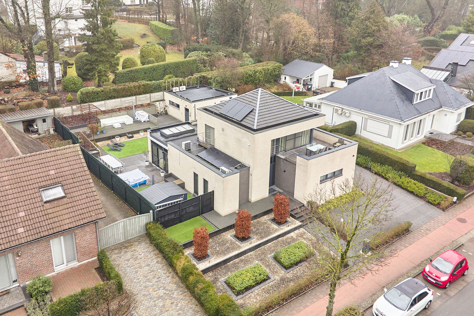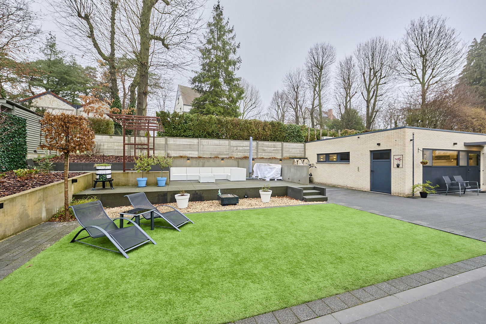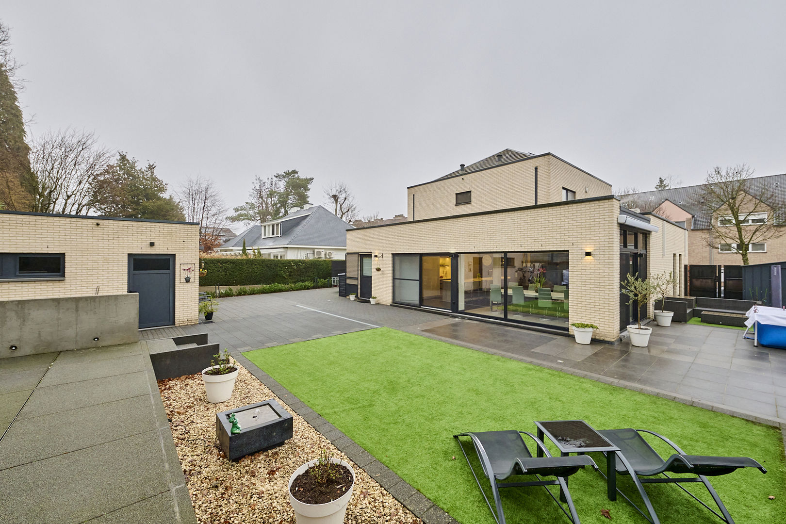 Prachtige, onderhoudsvriendelijke tuin met verschillende zithoeken waardoor je op alle momenten van de dag van de zon kan genieten. De zonneluifel kan ook voor de nodige schaduw zorgen. Het omheind perceel is afgesloten met een elektrisch bedienbare poort en de bekabeling voor een laadpaal is voorhanden. De aanwezige camera's verhogen je veiligheidsgevoel.