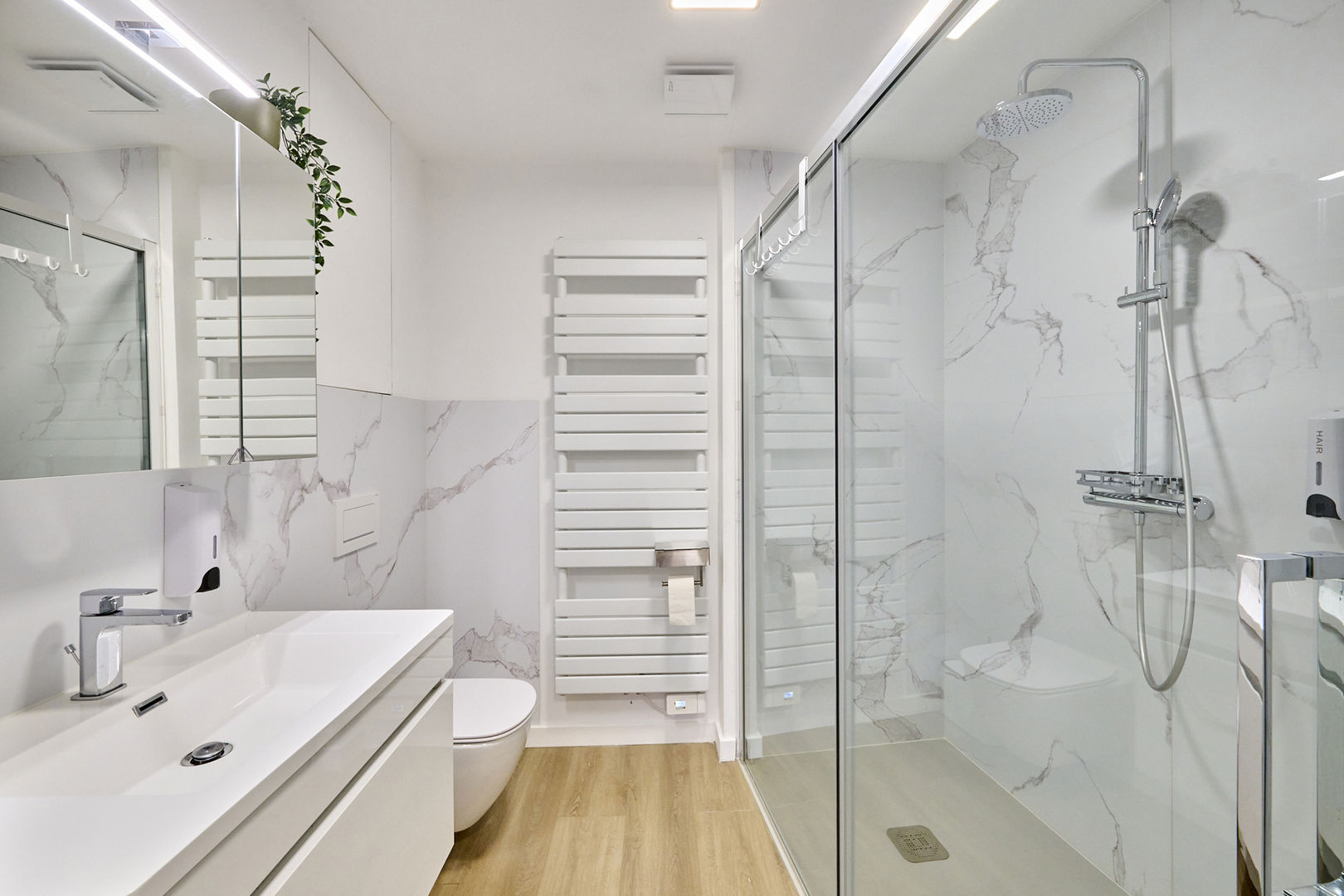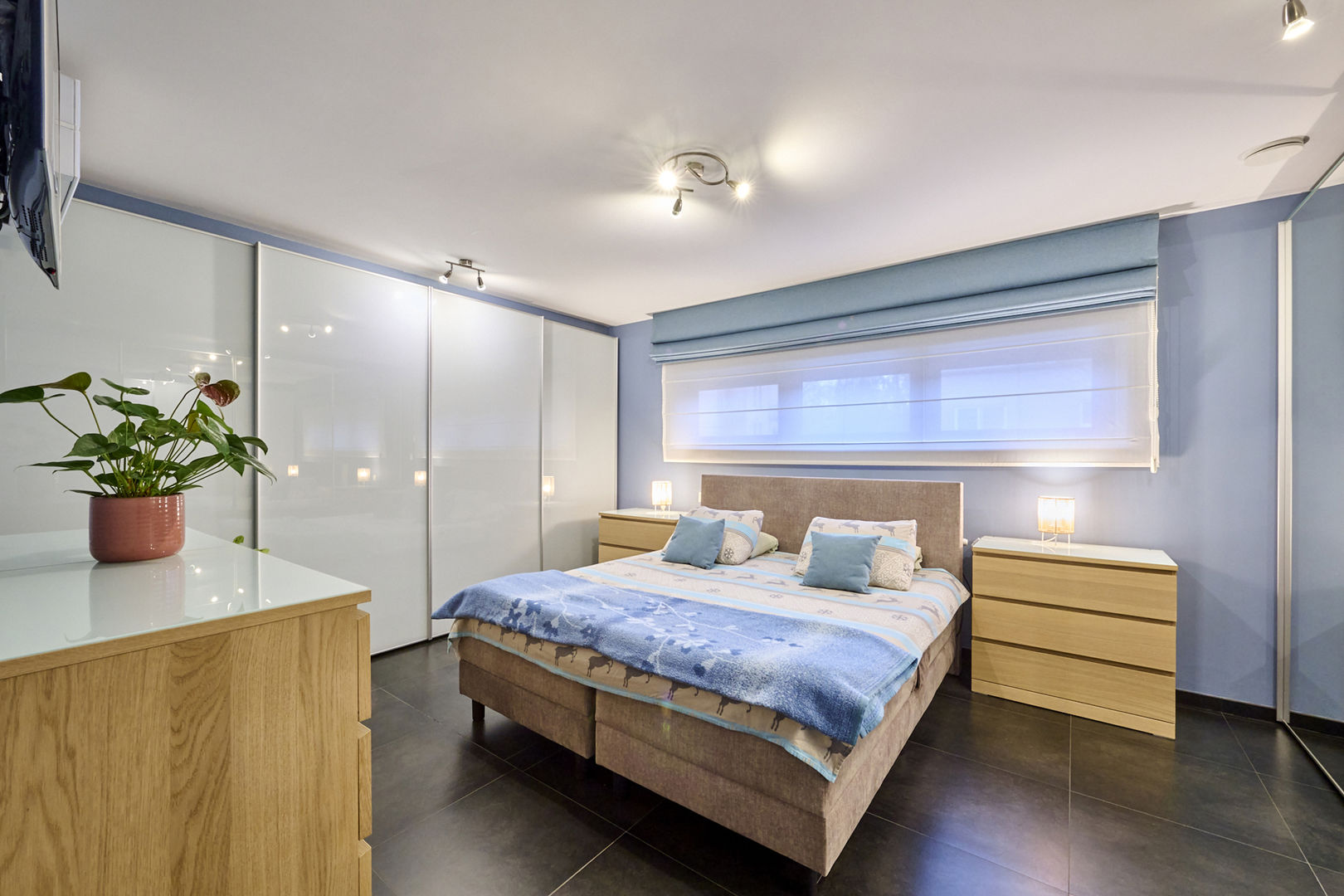 Gelijkvloers (bus 1) - 174m² (bron EPC): ruime inkomhal met toegang tot een apart toilet, vestiaire en 2 ruime slaapkamers, beiden voorzien van inbouwkasten. Langs de masterbedroom is er een badkamer met dubbele lavabo, ligbad, bidet en inloopdouche (mét verwarmde vloer). Aansluitend aan de 2de slaapkamer is er een ensuite badkamer met toilet, douche en lavabo.