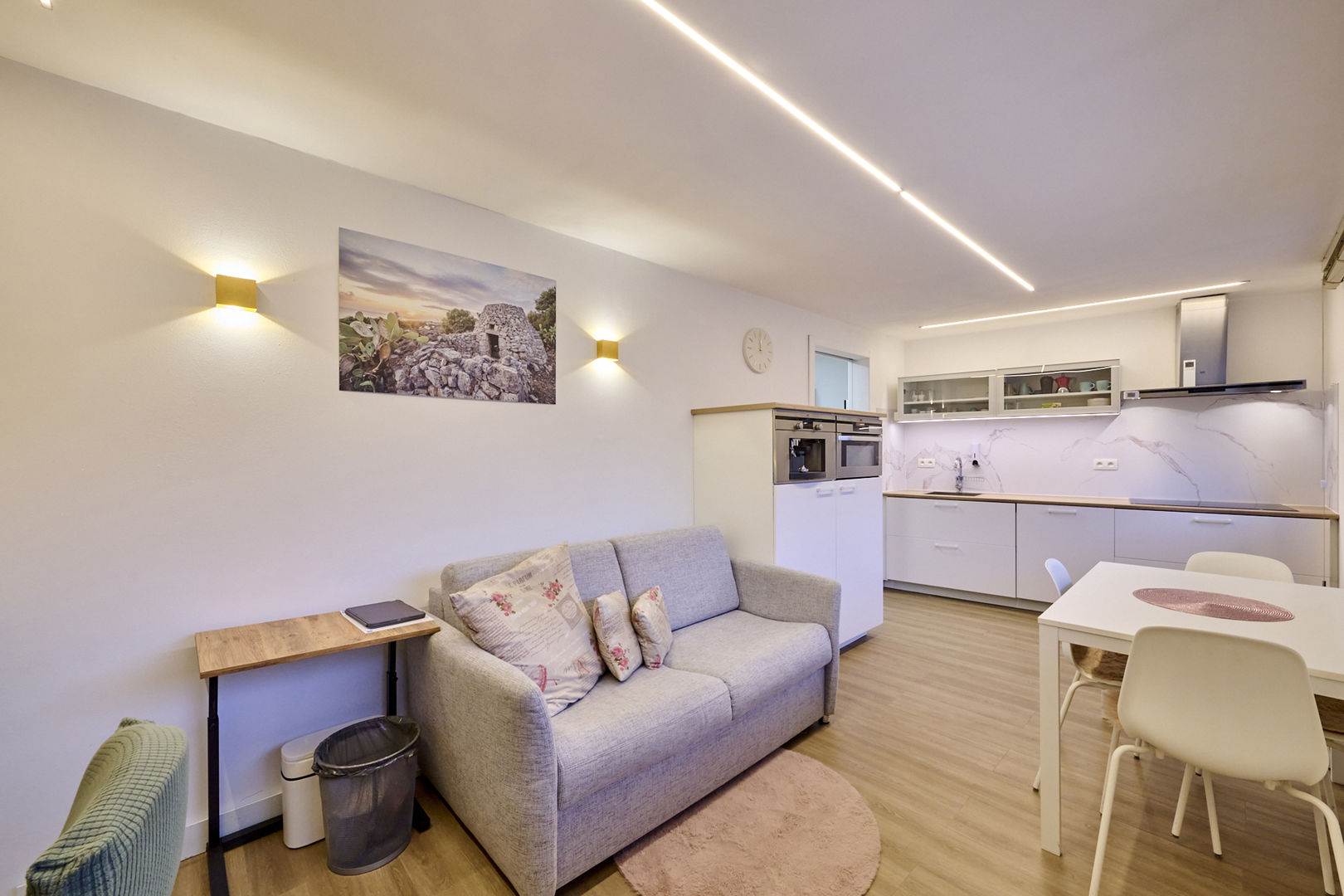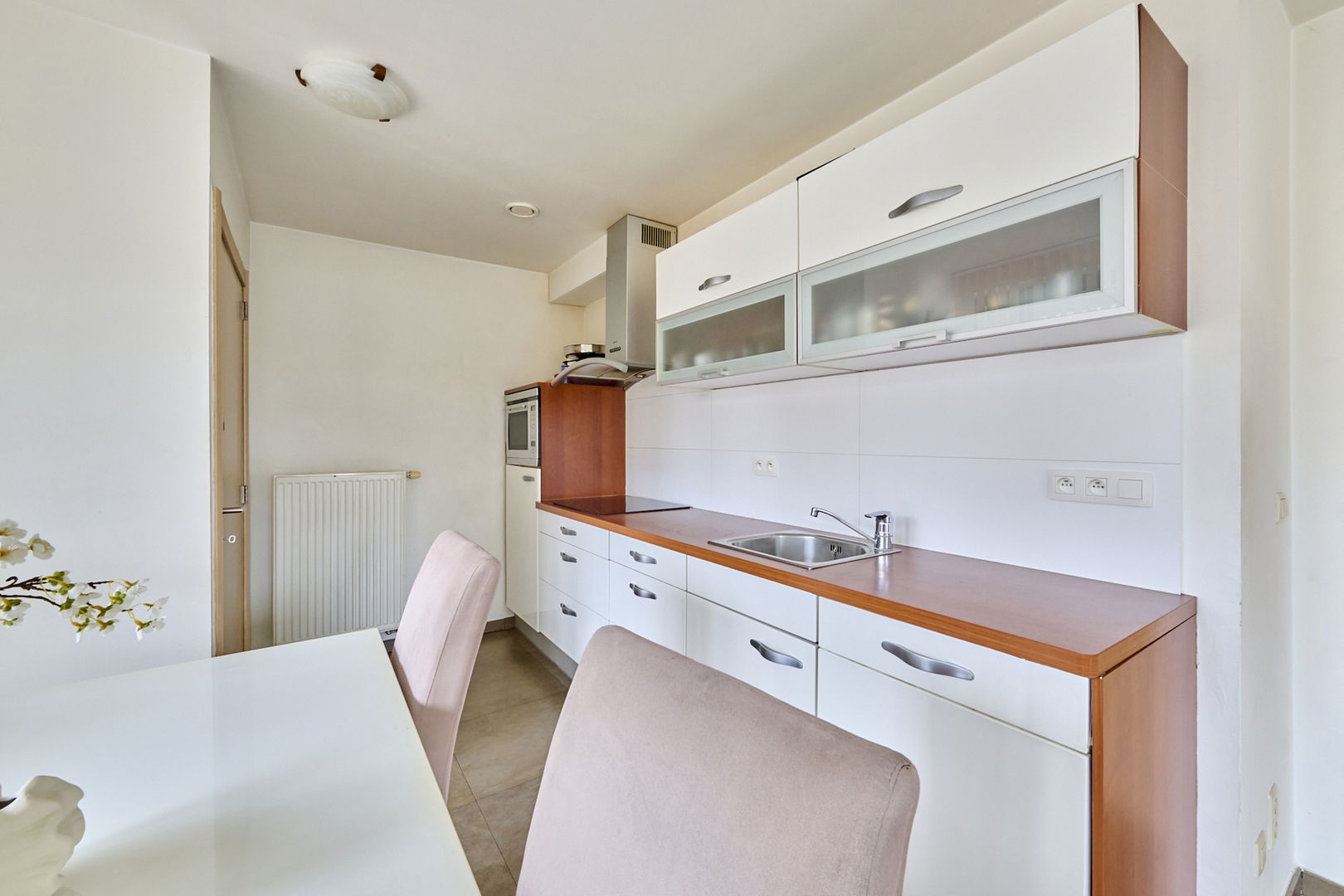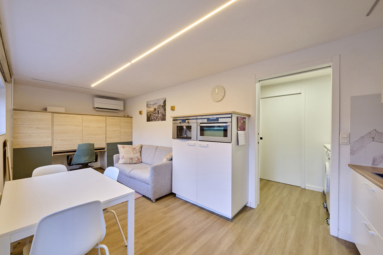 Via de glazen deur vanuit de inkomhal bereiken we de mooie leefruimte. Deze lichtrijke ruimte is ingedeeld in een gezellige zithoek met gashaard, een grote eethoek en aansluitend een fantastische leefkeuken met kookeiland. Hier zijn kosten noch moeite gespaard; de bewoners hebben gekozen voor een greeploze maatkeuken in corian met een "push-to-open" systeem. Alle toestellen zijn netjes ingebouwd (inductiekookplaat met geïntegreerde dampkap, koelkast, diepvries, combi-oven met stoomfunctie, combi-oven met pyrolysefunctie, Quooker-kraan) en als kers op de taart is er een koffiecorner. Door de grote raampartijen heb je een mooi zicht op de tuin en de dakkoepel creërt extra lichtinval. Aparte berging waar ook de CV-ketel en maatkasten zijn ondergebracht. Dankzij de zonnepanelen is er een opbrengst van 5760 Wp verdeeld over het gelijkvloers en de zorgwoning.