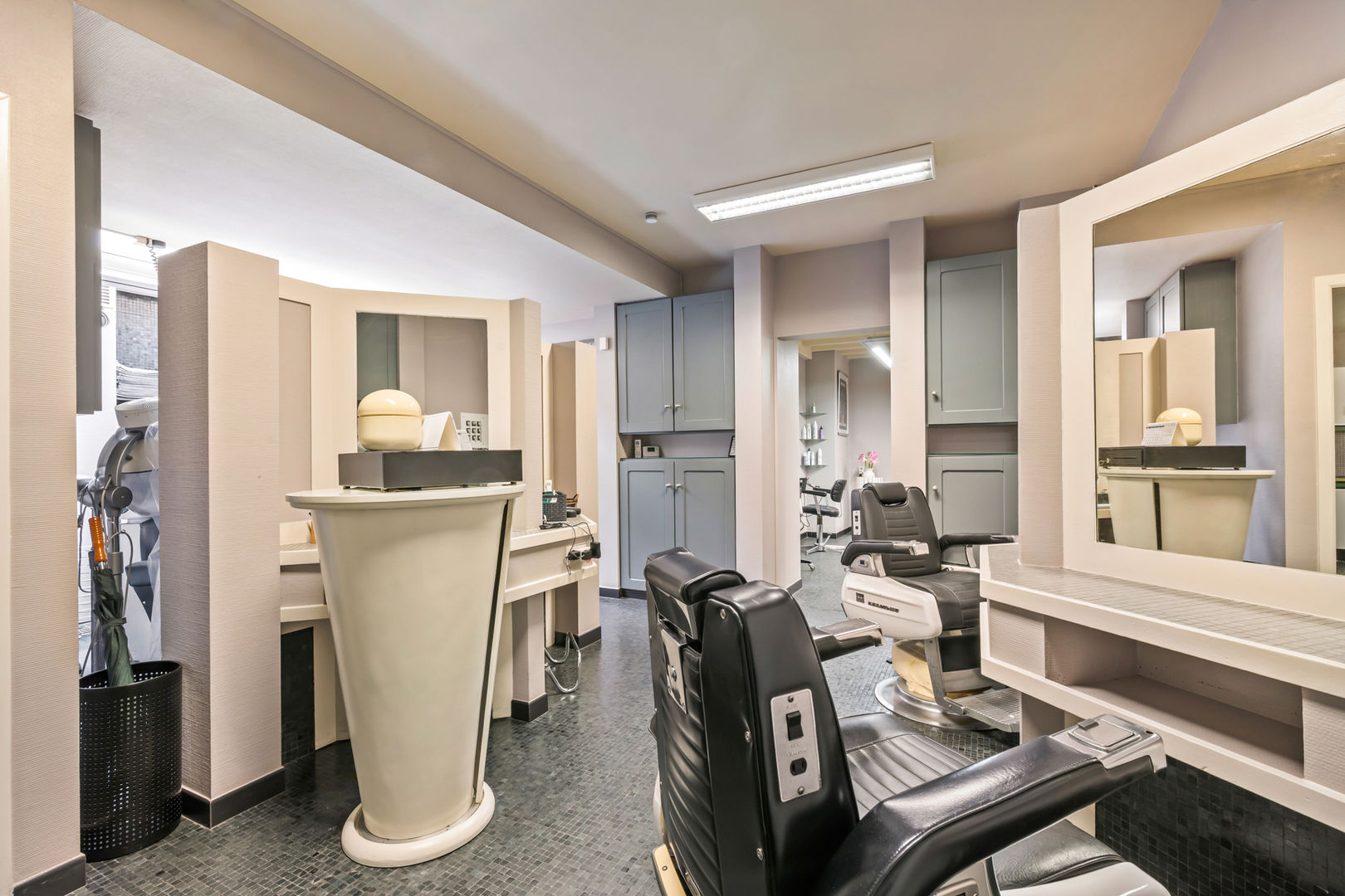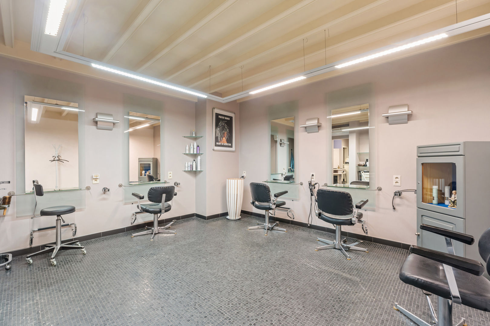 Verder is er nog een polyvalente ruimte die momenteel is ingericht als kapsalon met kitchenette. Een bijkomend pluspunt is de flexibele indeling hiervan. Een deel van het woongedeelte kan eenvoudig geïntegreerd worden in de voorgelegen handelsruimte dankzij een vlot verwijderbare tussenwand. Dit maakt de combinatie tussen privé en professioneel gebruik bijzonder praktisch.