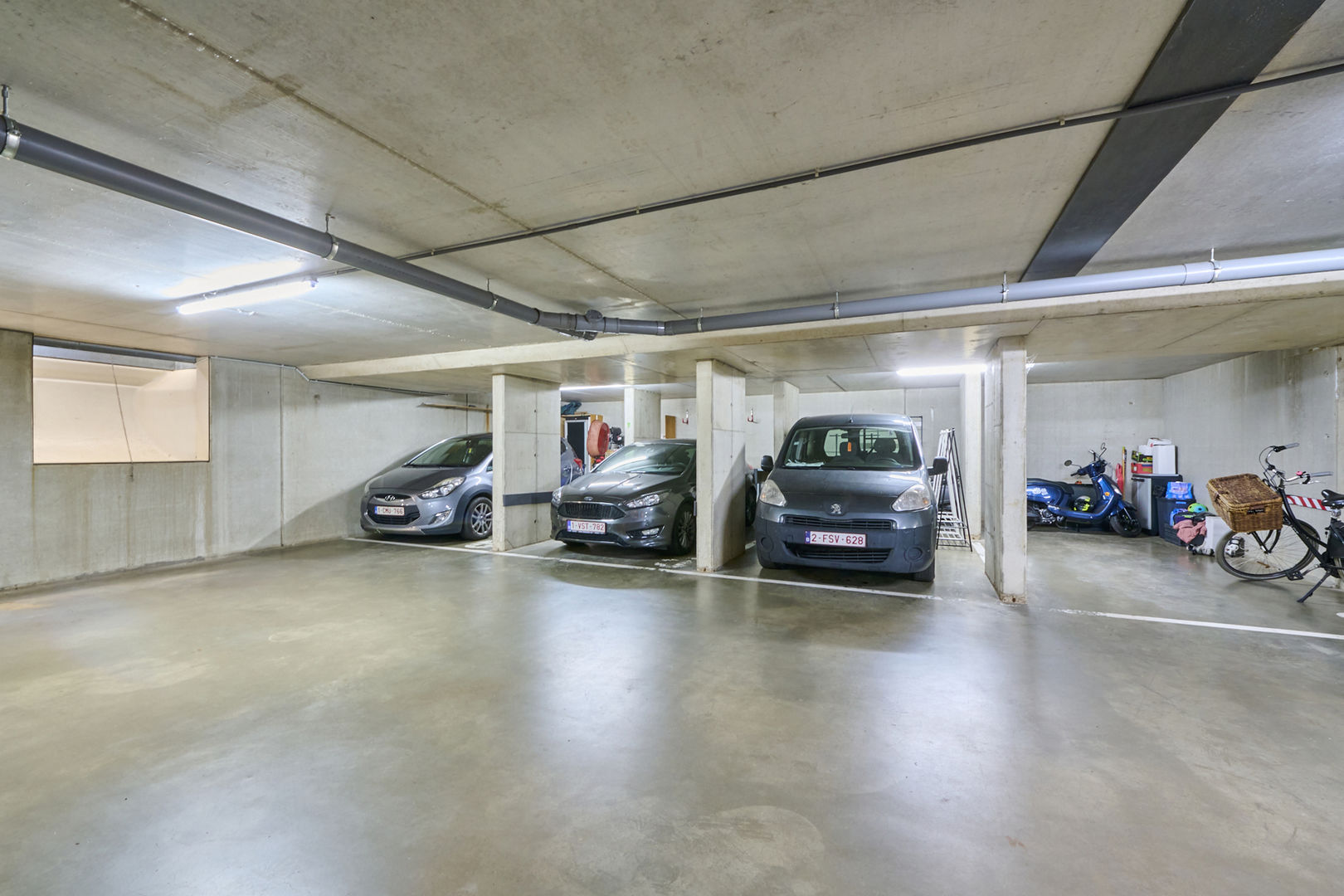 Je komt binnen via de inkomhal waar een vestiaireruimte voorzien is en een apart gastentoilet. De leefruimte met veel lichtinval heeft een zit- en eethoek en een open keuken. Zowel via de leefruimte als beide slaapkamers heb je toegang tot het deels overdekte terras met zuidelijke oriëntatie. Er zijn 2 slaapkamers aanwezig, een badkamer met bad en lavabo met kasten en een ruime berging waar er afvoer en aansluiting voorzien is voor het wasmachine). Het appartement beschikt ook over een ondergrondse parkeergarage nr. 6.