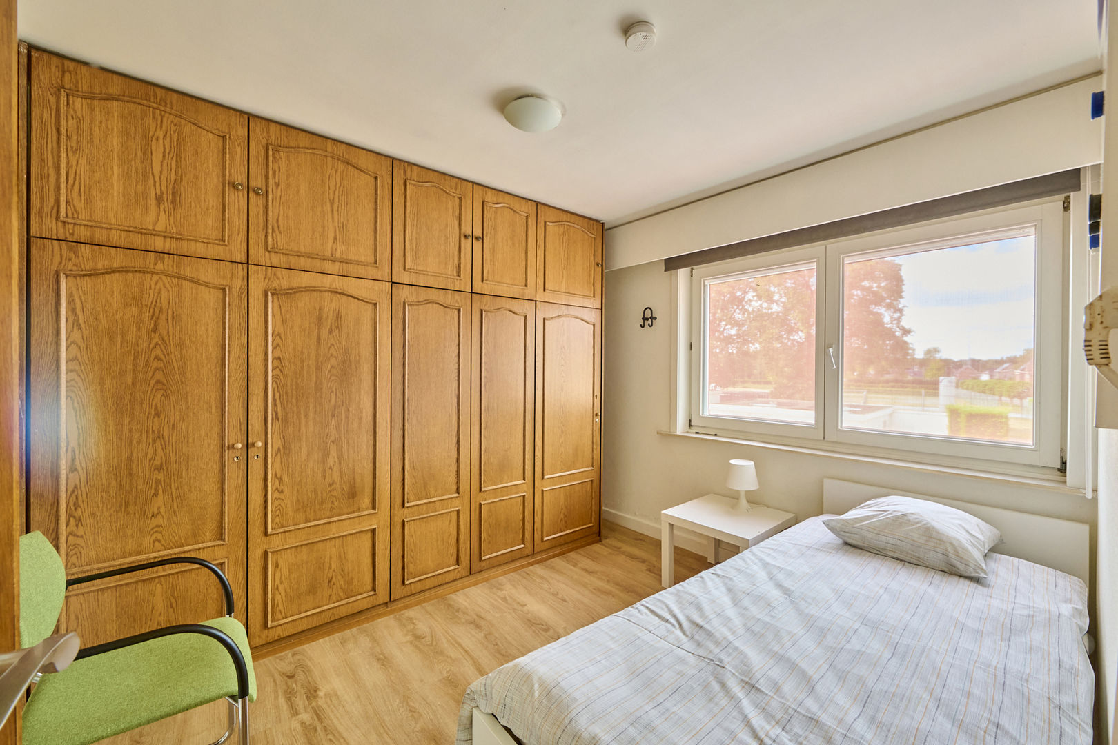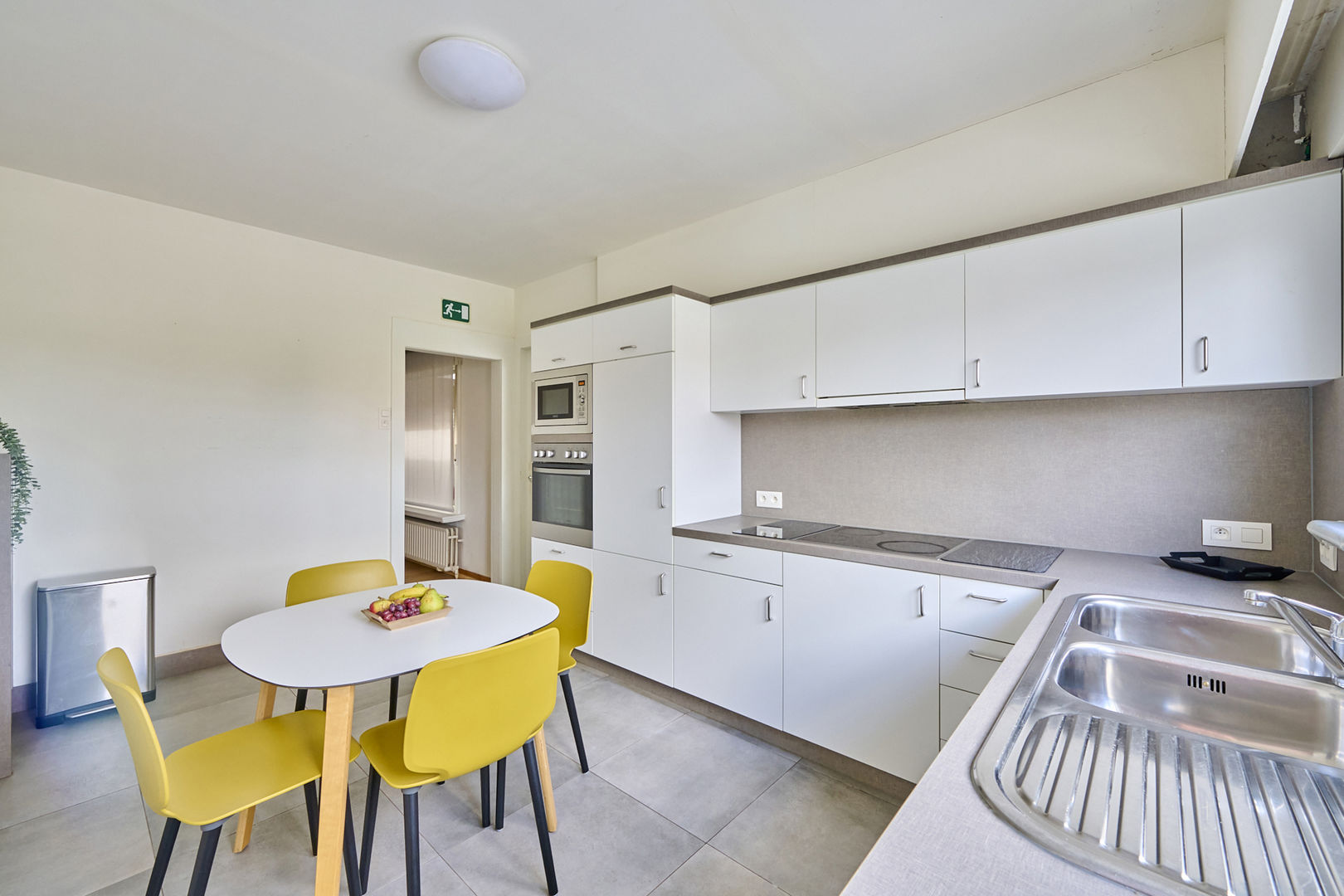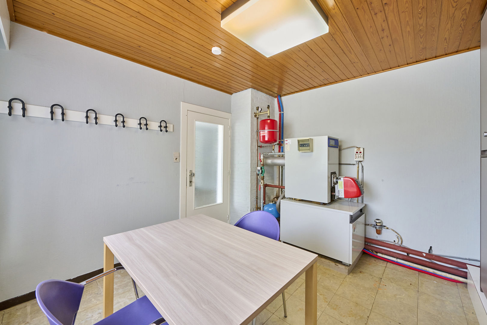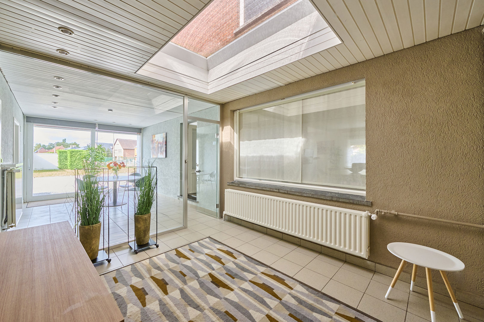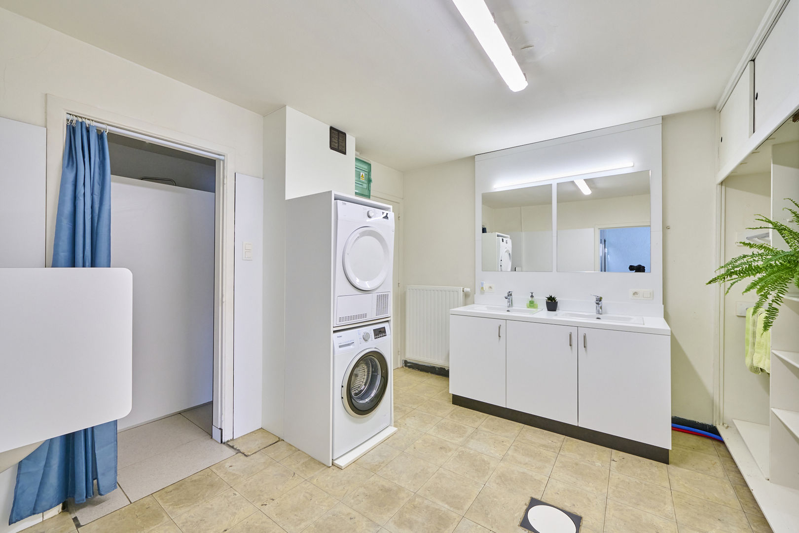 Gelijkvloers: inkomhal met trappenhal en doorgang naar de riante L-vormige leefruimte, waarin voldoende ruimte is voor een zit- en eethoek. De originele schouw is bewaard gebleven. Recent vernieuwde keuken met voldoende opbergruimte, inbouwtoestellen en een deur naar de kelder. Polyvalente ruimte, deels van elkaar afgescheiden door een glazen wand. Massa's lichtinval door het grote schuifraam en de dakkoepel. Badkamer met meubel met dubbele lavabo, aansluiting voor wasmachine, urinoir, twee douchecabines en een apart toilet. Tot slot is er nog een extra stookruimte met doorgang naar de tuin.