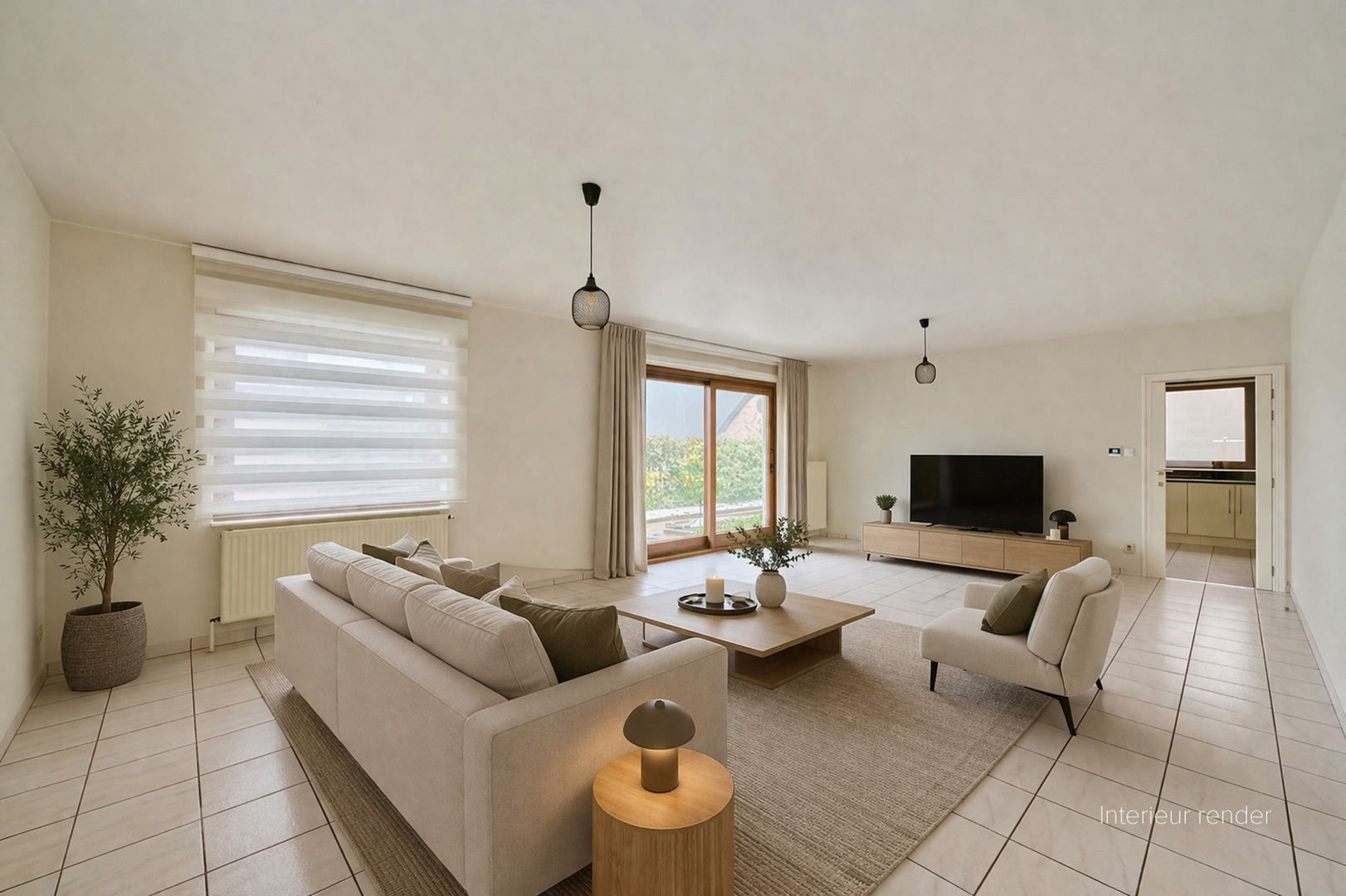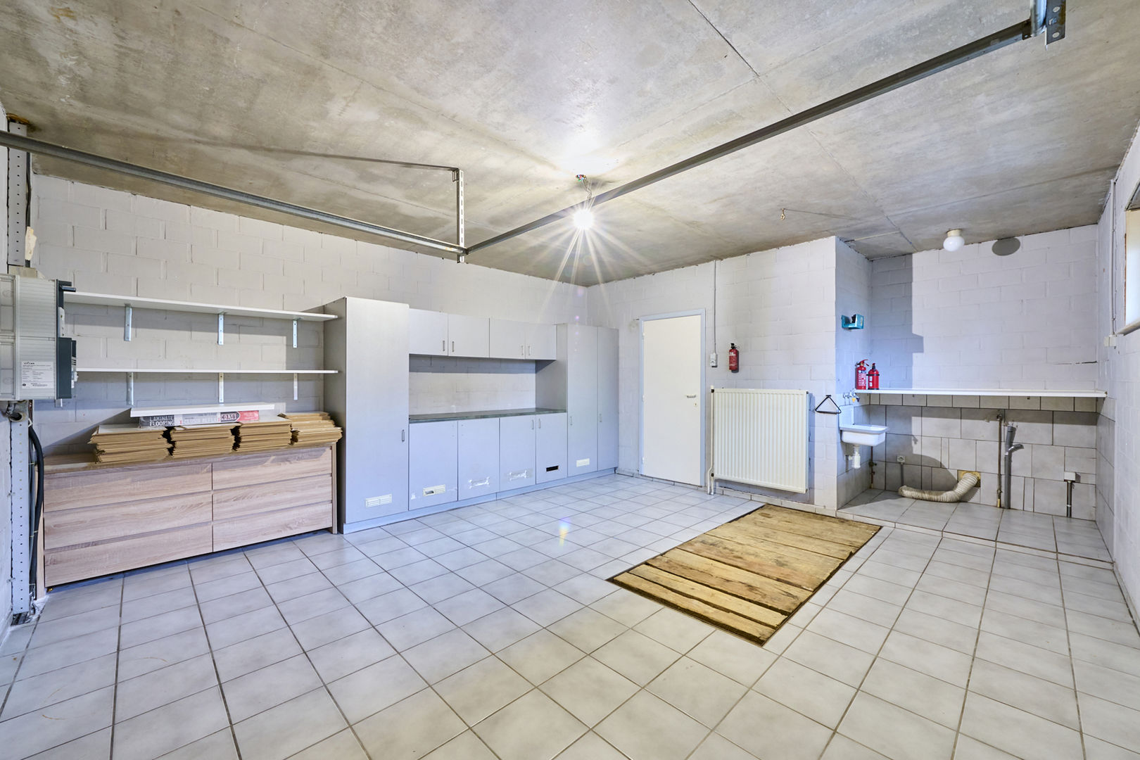 Gelijkvloers: Inkomhal met toegang tot de zeer ruime leefruimte met een extra terras. Ruime keuken met zicht op de tuin, een achterinkom met apart toilet en een ruime garage met smeerput.