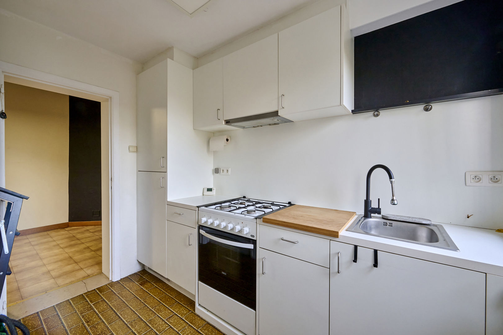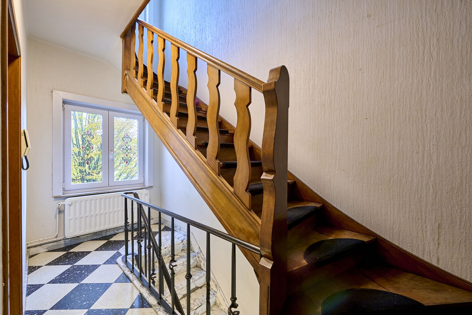 Eerste verdieping: trappenhal. Keukenruimte met eetplaats en apart toilet. Achterdeur met overdekt terras waardoor toegang tot de tuin via de trap. Gezellige leefruimte in L-vorm met originele schouw en parketvloer.