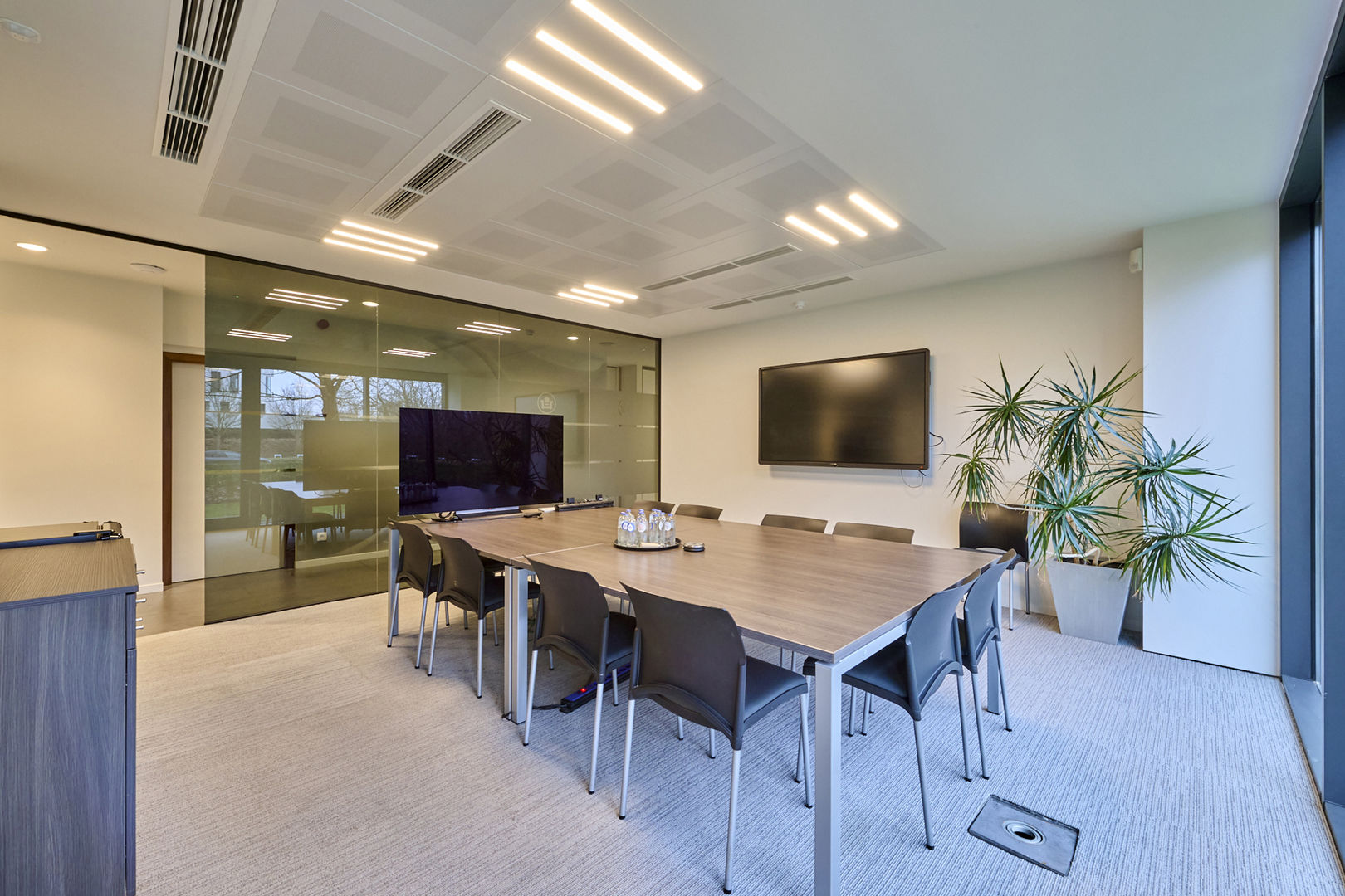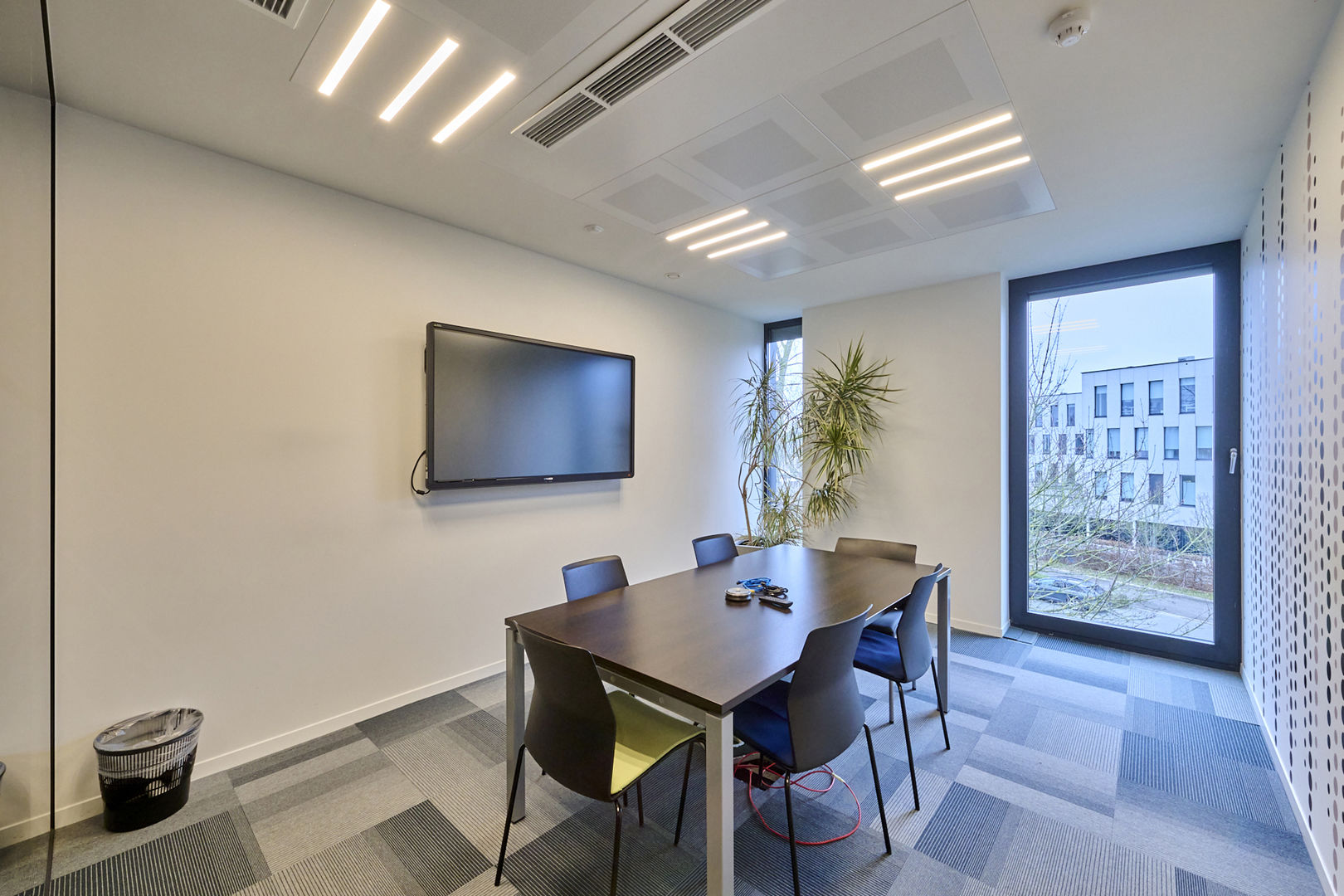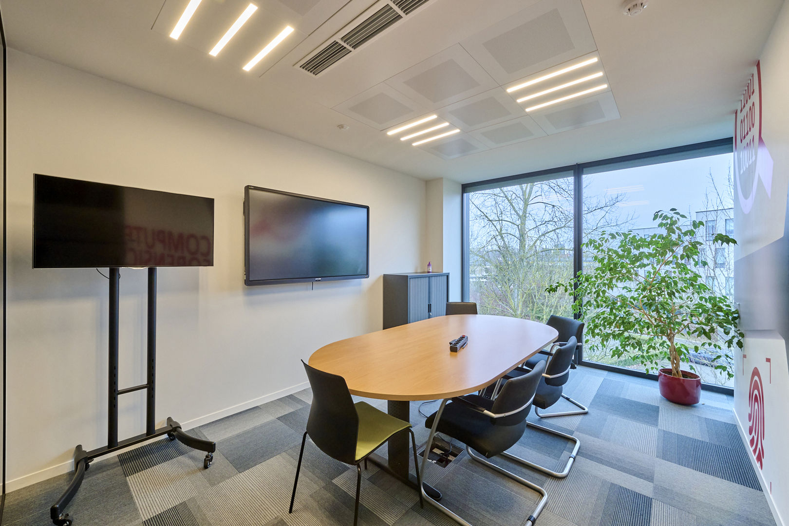 2x16 werkplekken met ergonomische stoelen Elk bureau uitgerust met minstens 4 stopcontacten, vaste internetaansluiting en digitale tv-aansluiting Opbergkasten aanwezig 2 grote tv-schermen geschikt voor presentatiesAll-in voorzieningen (inbegrepen in de huur)