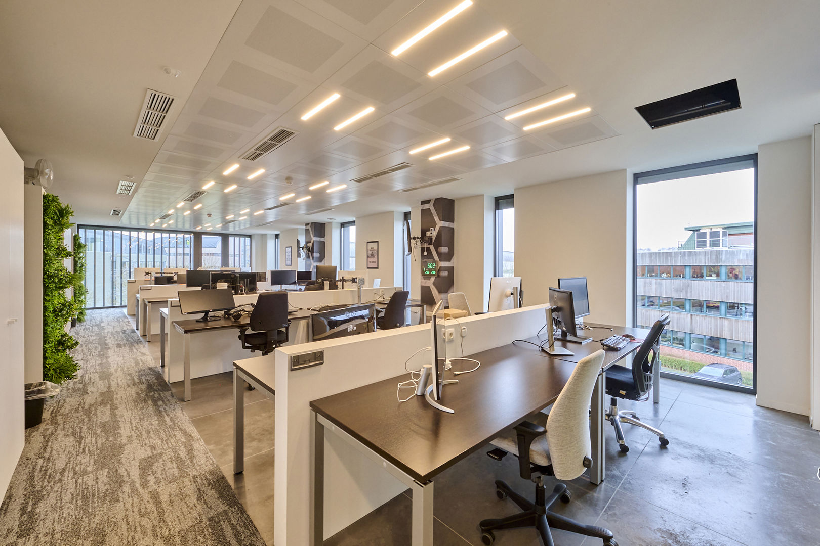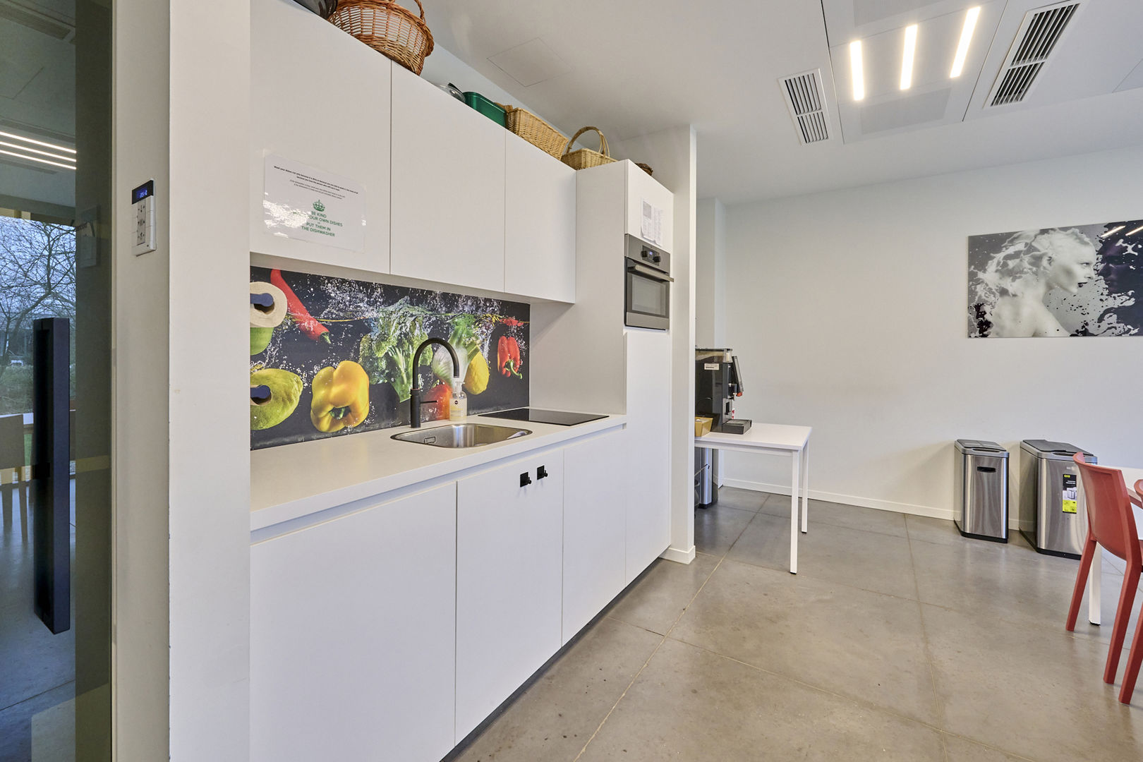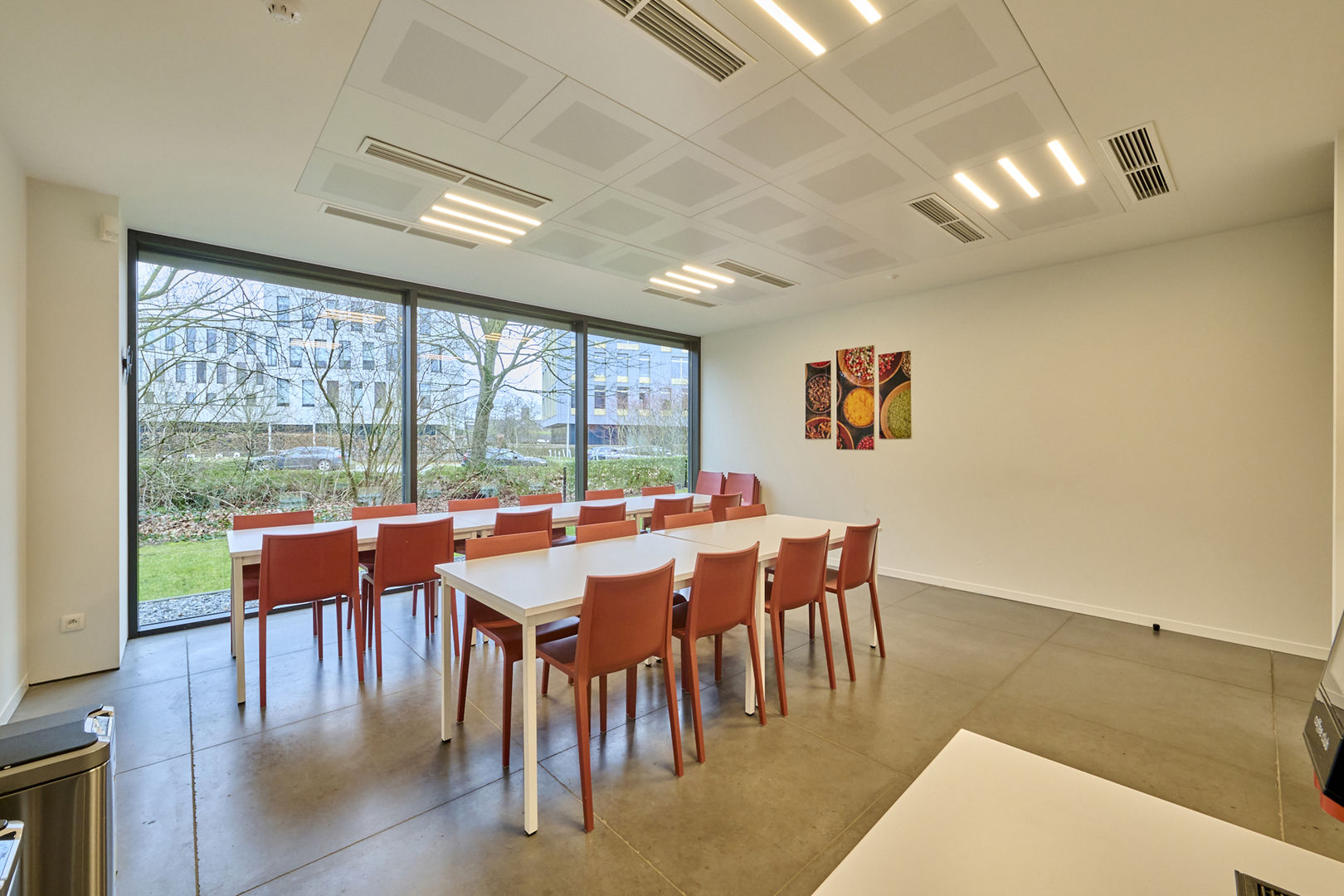 Gas, elektriciteit en water Individuele bediening van screens, verwarming en koeling Wekelijkse poetsdienst Beveiliging van het kantoor Afvalbeheer Garagebox voor fietsers 4 laadpunten voor elektrische wagens Toegang tot het gebouw via fingerprint Tuinonderhoud Gebruik van 6 vergaderzalen (waarvan 4 met touchscreens, bruikbaar voor presentaties, als digitaal whiteboard of voor online meetings) Print- en scanfaciliteiten Ruime ontspanningszone met kickertafel, darts en pingpong 2 douches en 4 toiletten 2 keukens, waarvan één grote refter met koelkast, vaatwasser, oven en kookfornuis Koffie, vers en gekoeld water beschikbaarNiet inbegrepen