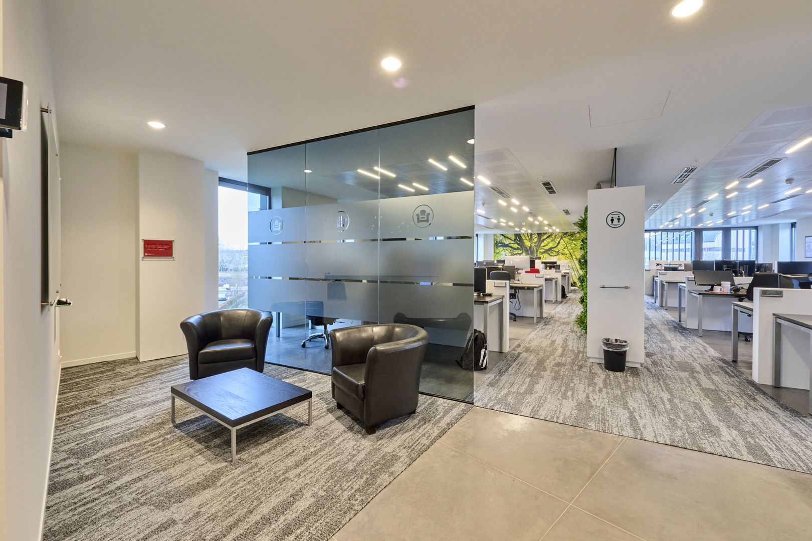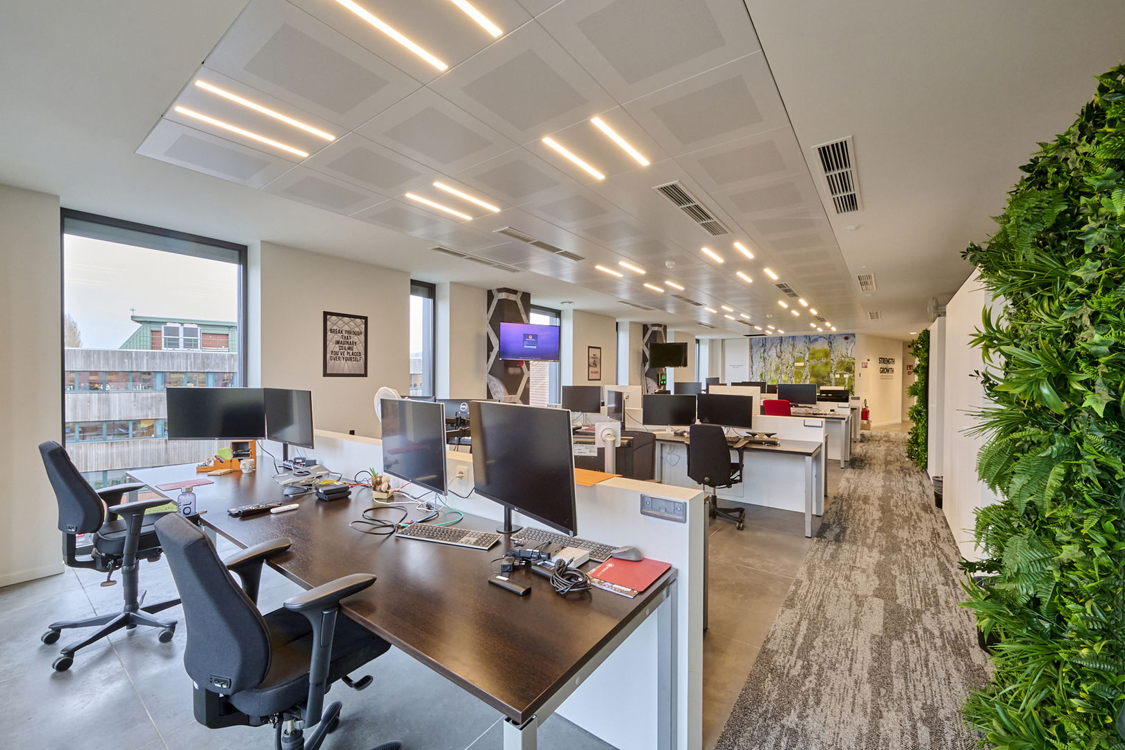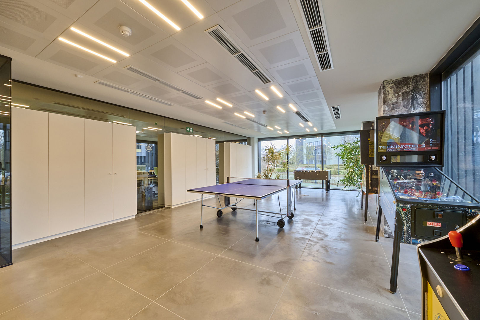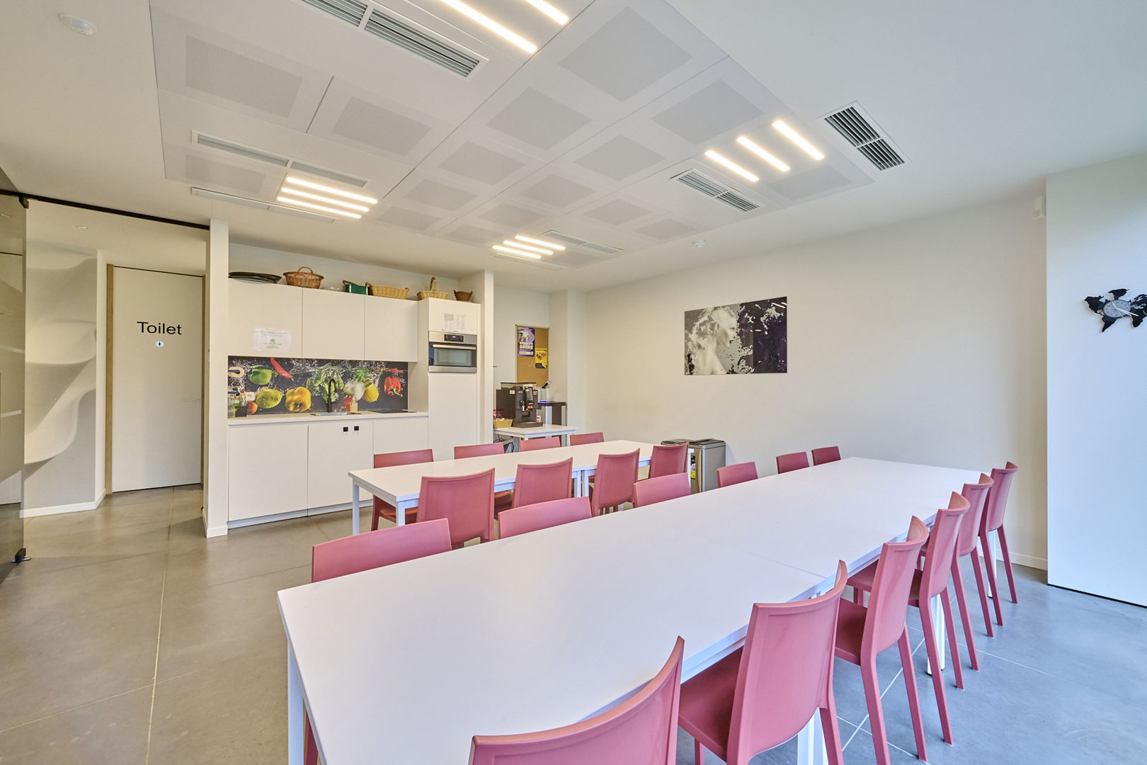 Gas, elektriciteit en water Individuele bediening van screens, verwarming en koeling Wekelijkse poetsdienst Beveiliging van het kantoor Afvalbeheer Garagebox voor fietsers 4 laadpunten voor elektrische wagens Toegang tot het gebouw via fingerprint Tuinonderhoud Gebruik van 6 vergaderzalen (waarvan 4 met touchscreens, bruikbaar voor presentaties, als digitaal whiteboard of voor online meetings) Print- en scanfaciliteiten Ruime ontspanningszone met kickertafel, darts en pingpong 2 douches en 4 toiletten 2 keukens, waarvan één grote refter met koelkast, vaatwasser, oven en kookfornuis Koffie, vers en gekoeld water beschikbaarNiet inbegrepen