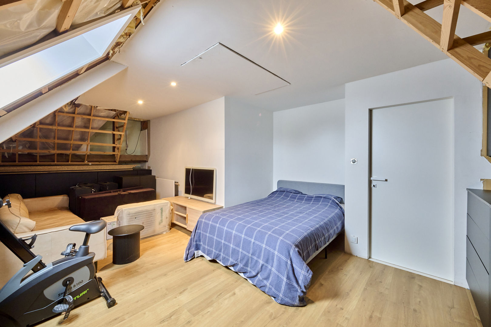 Op de verdieping bevindt zich de ruime masterbedroom met een ensuite badkamer, uitgerust met een prachtig vrijstaand bad. Verder zijn er twee grote kamers waarvan 1 nog beperkt verder dient afgewerkt te worden. Ook is er nog een aparte, ruime badkamer.