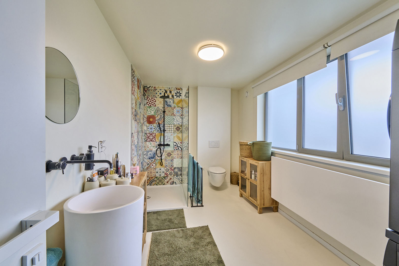 Via de ruime inkomhal betreden we de woning. Op het gelijkvloers werd overal gekozen voor een stijlvolle witte gietvloer, die doorloopt in de trap en zorgt voor een strak en modern geheel. De lichtrijke leefruimte sluit aan op de prachtige leefkeuken. Deze keuken is een echte eyecatcher en beschikt over een groot eiland, een volledige kastenwand en kwalitatieve toestellen van degelijke merken. Aansluitend bevindt zich de ruime eetplaats met een mooi zicht op de zonovergoten tuin. Verder is er nog een bureelruimte (kan ook dienen als extra slaapkamer), een apart toilet en een bijkeuken met wasplaats en technische installatie.